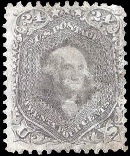 1863, 24¢ Washington, gray (Scott 78b), lightly canceled; a blunt corner perf at top right, about Fine. Scott $475. Estimate $60 - 80. Scott $475 Suggested Bid $60-80 (Image)