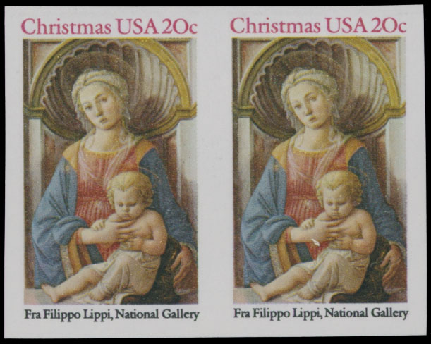 1984, Christmas issue, Madonna and Child, 20c multicolored, horizontal imperforate pair, light horizontal crease, full OG, NH, VF appearance of this scarce error, C.v. $1,400, Est. $300-$350 (Image)