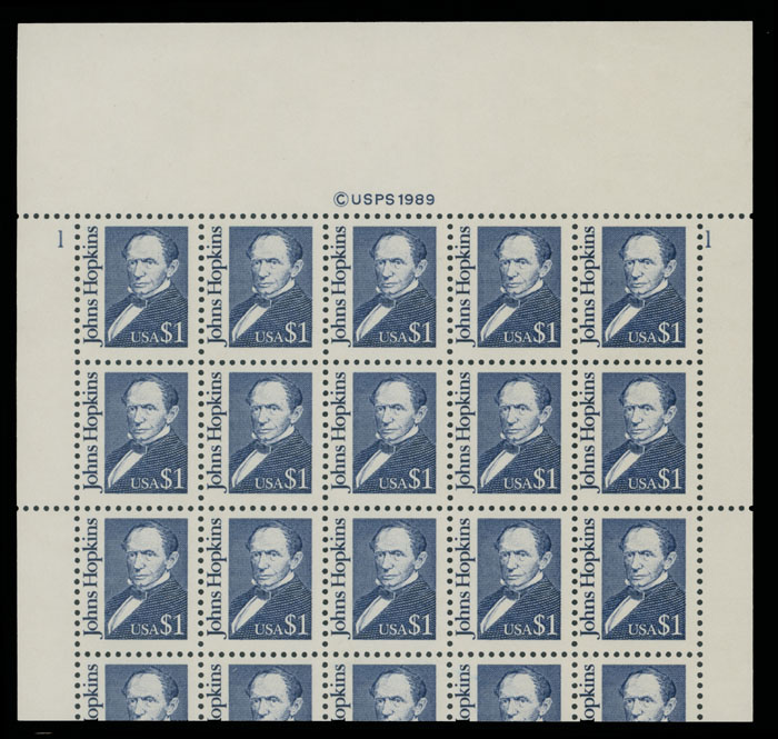 1989, John Hopkins, $1 dark blue, pane of 15 plus 5 top halves at foot due to considerable and unusual miscut, plate No.1 at left and right, top margin is approximately 35mm, full OG, NH, VF and very rare, Est. $1,000-$1,200 (Image)