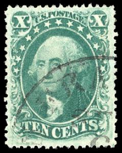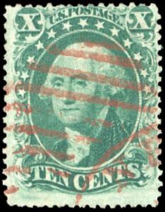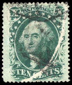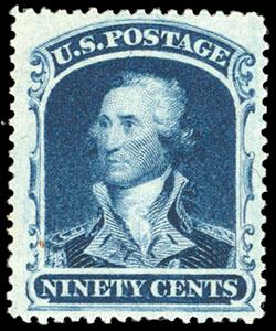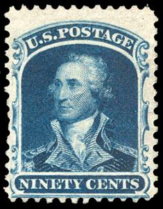 The 90¢ stamp was released in 1860. Once the Civil War broke out, the Federal government demonetized the entire 1857 Issue, the 90¢ stamp had only been in circulation for a year. Stocks from northern post offices were returned and destroyed, while stocks in southern post offices, if not completely destroyed, were often mishandled. Given the short life of the issue, it is a wonder that any of the scarce 1860 90¢ Blue have survived in this gem never hinged condition. US$10,000-15,000 (Image)