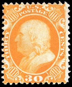 1860, 30¢ orange. O.g., previously hinged, beautifully centered, vibrant fresh color, sharp impression, an Extremely Fine gem, with 2021 P.F. certificate Graded (XF 90), by way of comparison the P.S.E. has recorded only six examples graded higher, the SMQ value for a XF 90 is $5,000. Scott No. 38; $1,900.