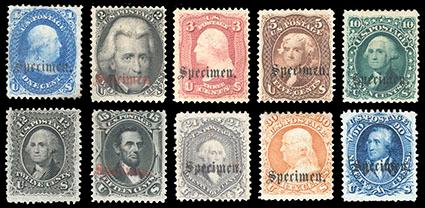 1861-1866 1¢-90¢ complete set of 10 with specimen overprints. Part o.g. or without gum, with type B SPECIMEN overprints (12¢ very light as usual), F.-V.F. Scott No. 63SB-78SB; $2,120. US$0 (Image)