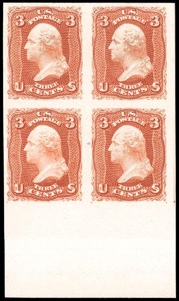 1861, 3¢ rose, plate proof on India paper. Bottom margin block of 4 mounted on card, Very Fine. Scott No. 65P3; $550. US$0 (Image)