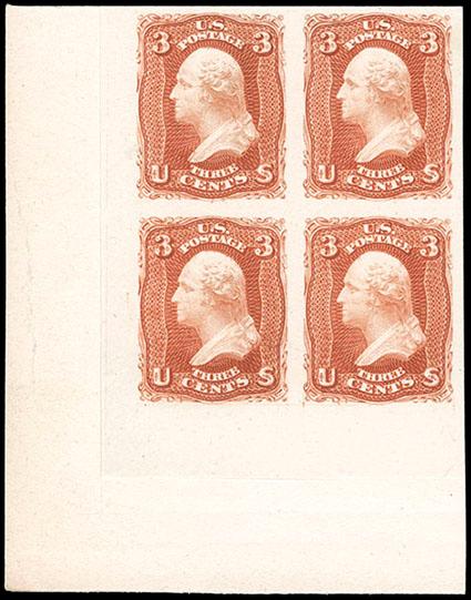 1861, 3¢ rose, plate proof on India paper. Lower left corner margin block of four, Extremely Fine. Scott No. 65P3; $550. US$0 (Image)