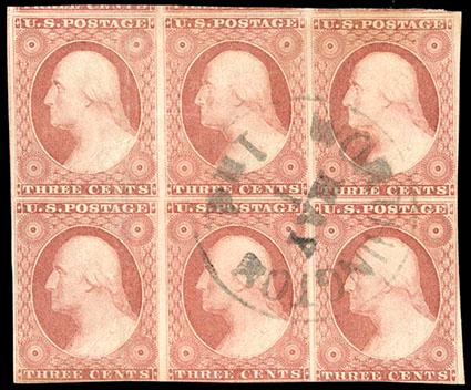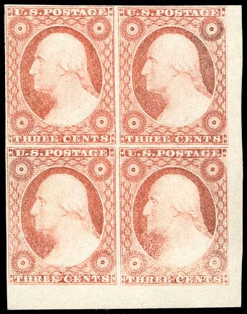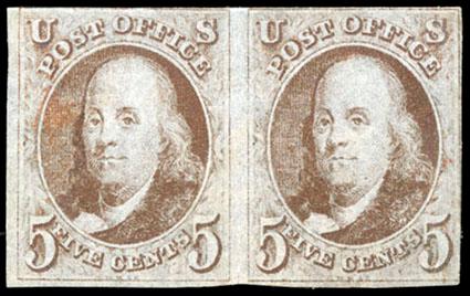 1847, 5¢ red brown. Horizontal pair, o.g., margins large at left to in at top left and lower right tiny scissor cut between margin at bottom, Fine, an affordable original gum multiple of the 1847 5¢ issue, with photocopy of 2002 P.S.E. certificate for block. Scott No. 1; $15,000. US$0 (Image)