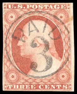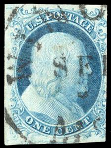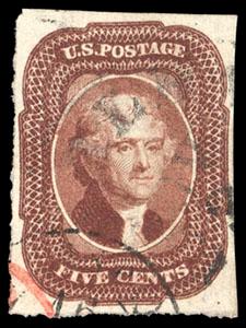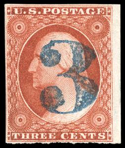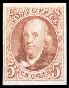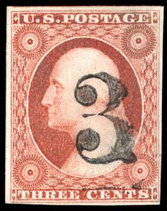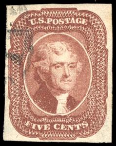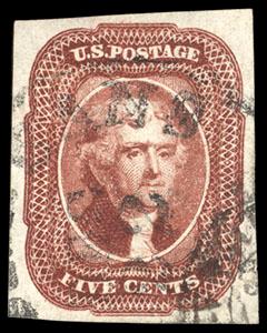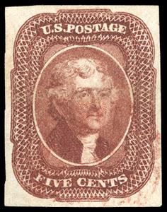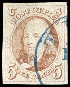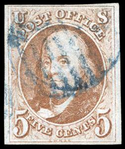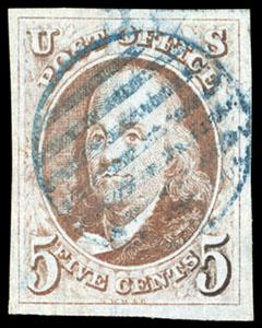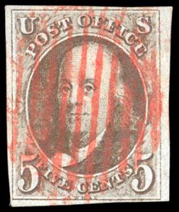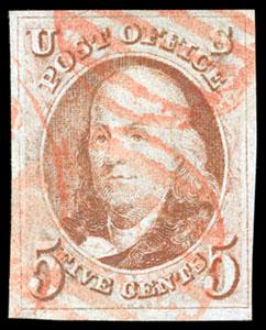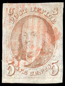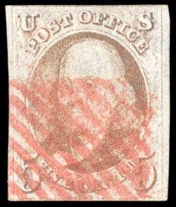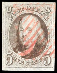1847, 5¢ brown. Central red numeral "5" cancels, full well balanced margins, Very Fine and choice,ex-Matthies. Scott No. 1; $525. US$0 (Image)