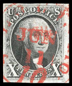 1847, 10¢ black. Sharp central red paint St. Louis integral rate town cancel, large to huge margins, bold color and sharp impression, Extremely Fine and choice, a remarkable stamp and cancellation, with 2011 P.F. certificate. Scott No. 2; $850. US$0 (Image)