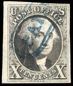 1847, 10¢ black. Neat blue "Paid" cancel of Philadelphia, four ample to large margins, deep impression, Very Fine, with 2025 P.S.A.G. certificate Graded (80). Scott No. 2; $850. US$0 (Image)