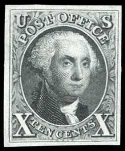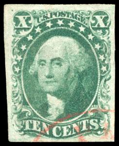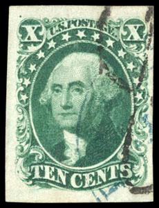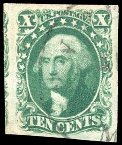 1855, 10¢ green, type II. Four nice margins, light town cancel, F.-V.F., with 1991 P.F. certificate. Scott No. 14; $145. US$0 (Image)