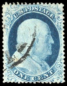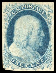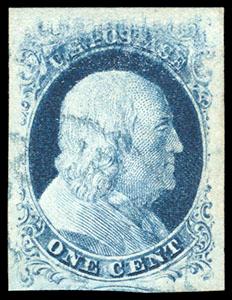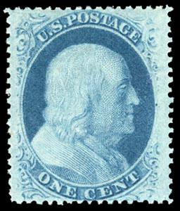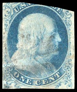 1857, 1¢ blue, type IIIa. Intense color; diagonal crease at upper left and a couple of minor margin faults, Very Fine appearance, great looking example, with 1998 P.S.E. certificate. Scott No. 22; $475. US$0 (Image)