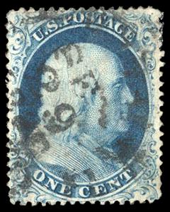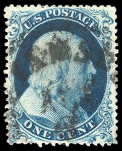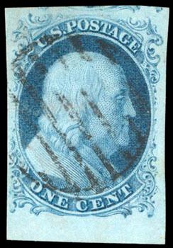 1857, 1¢ blue, type IV. Partial strike of town cancel, beautifully centered, deep color and sharp impression, Very Fine to Extremely Fine, a lovely example of this difficult issue, with 1986, 2012 & 2025 P.F. certificates, last Graded (VF-XF 85). Scott No. 23; $575. US$0 (Image)