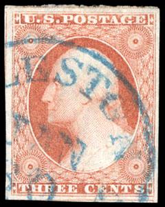 1852, 3¢ dull red, type II. Neat blue Charleston, S.C. town cancel, large to huge margins showing portions of adjacent stamps on three sides, brilliant color, Extremely Fine to Superb, with 2025 Crowe certificate Graded (XF-Sup 95, SSV $225). Scott No. 11A; $15. US$0 (Image)