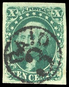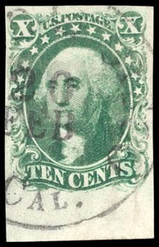1855, 10¢ green, type I. Bottom margin single, neat San Francisco, Cal. town cancel, full well balanced margins, strong color, Very Fine and attractive, with 2010 P.S.E. certificate. Scott No. 13; $750. US$0 (Image)