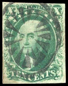 1855, 10¢ green, type II. Fancy circle of sixteen wedges in oval geometric cancel (S-E GE-P17), margins clear to just touching, Very Fine. Scott No. 14; $145. US$0 (Image)