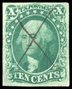 1855, 10¢ green, type IV. Position 3R1 with outer line recut at top, neat manuscript "X" cancel, our full to large margins, strong color and impression, Very Fine. Scott No. 16; $850. US$0 (Image)