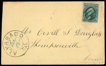 (Alameda) Alvarado, Cal. Feb 18. Double circle postmark (Williams ALA-370) on cover to Thompsonville, Conn., franked with 1861 10¢ green (68) with blue manuscript cancel, docketed on verso "Centerville Feb 14, 1862"; reduced at left, F.-V.F. Estimate; $100 - 150. US$100-150 (Image)