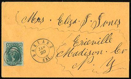 (Sacramento) Mormon Island, Cala., June 27. Triple oval postmark (SAC-1910) with manuscript "10" rate marking on stampless orange envelope to Maine, F.-V.F., a scarce California fancy town marking. Estimate; $100 - 150. US$100-150 (Image)
