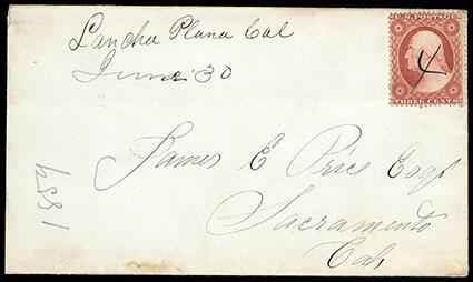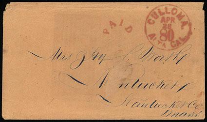 (El Dorado) Culloma, Alta Cal. Apr 28/80. Integral rate postmark in red plus "Paid" red arc handstamp on cover to Nantucket, Massachusetts, double 40¢ transcontinental rate prepaid, corner wear at top, surface scrape affecting one letter of the address, still Very Fine, a lovely cover and very rare postmark, illustrated in Coburn's Letters of Gold (page 305). Estimate; $400 - 600. US$400-600 (Image)