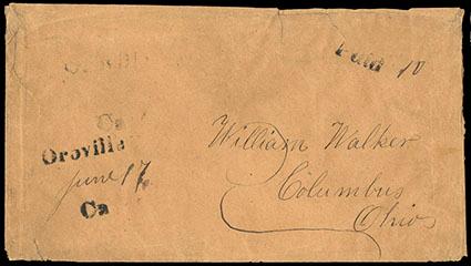 (Butte) Oroville, Ca, Jun 17. Straight line postmark (BUT-3070) on buff stampless cover to Columbus, Ohio with handstamped "Paid" and manuscript "10" rate marking, edge wear and a few small tears, otherwise Very Fine, a classic California rarity, 2 stampless and 1 on 1853 Nesbitt entire are currently recorded. Estimate; $300 - 400. US$300-400 (Image)