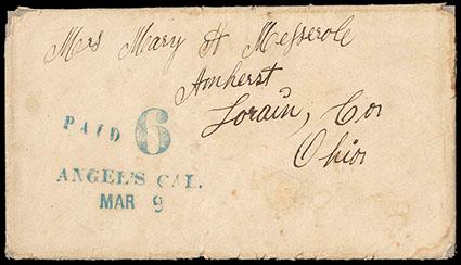 (Calaveras) Angel's Cal. Mar 9. Bold two-line handstamp in blue on cover to Ohio with "PAID" and "6" in matching blue ink; similar to Williams' CAL-60 three-line handstamp, but with different configuration of lettering into two-line; thus, unlisted in Williams; edge & corner wear, Very Fine and rare, The only reported example of this type postmark. Estimate; $400 - 600. US$400-600 (Image)