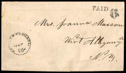 (Calaveras) Mokelumne Hill Cal, April 26. Black cds (CAL-1610) with integral "Paid" and "6" rate on stampless cover to New York (ca 1853-1854); some light cover wrinkles, Very Fine and scarce. Estimate; $100 - 150. US$100-150 (Image)