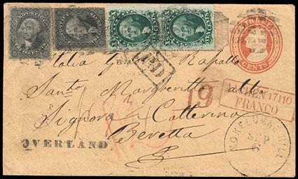 (Calaveras) Mokulumne Hill, Cal. Black cds with several strikes of waffle grid killer on 1853-55 3¢ Nesbitt entire (U10) additional franked with two single 1857 12¢ black adhesives (36), potentially replaced (read below) and vertical pair of 1857 10¢ green, type V (35) to Santa Margheritta, Sardinia, Italy; the adhesive stamps are applied over the top of a Wells, Fargo & Co. printed frank with the envelope apparently being used without carriage by Wells, Fargo & Co.; black straight line "OVERLAND" handstamp (Type 2) applied in San Francisco; total 47¢ postage overpaying the 42c rate to Sardinia via Prussia; various other markings include red italic "19" (credit from New York to Prussia, which included 12¢ postage beyond the German Austrian Postal Union); manuscript "f3¾" indicates the foreign postage in silbergroschen; probably carried on the last voyage of the North Atlantic Steamship Company Adriatic, which sailed Oct 6, 1860 and arrived in Southampton on Oct 17; with a total of seven (7) various backstamps and forwarding markings on verso; 2000 P.F. certificate states "It is a genuine usage, the right 12c stamp with a tear at bottom, and the entire with a repaired spindle hole at left"; however, a June, 2011 article in Western Express, co-authored by Richard Frajola and Michael Perlman (cover census SFC2-1) notes that "clean PFC but two 12¢ replaced"; therefore sold AS IS, Very Fine appearance, a rare example of an "Overland" handstamped cover mailed to Sardinia, Italy. Estimate; $300 - 400. US$300-400 (Image)