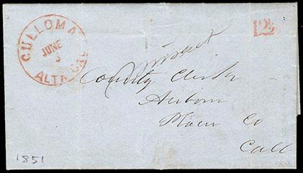 (El Dorado) Culloma, Alta Cal. Jun 5. Postmark in red (Williams ELD-410) on blue 1851 folded letter to Auburn, Cal. with matching "12½" rate marking in red, manuscript notation "Missent", however there is no indication as to where it was missent, letter regarding the schedule of the Court, two light vertical file folds (one through cds), Very Fine, very scarce with rate outside of postmark,ex-Newton & Tatham. Estimate; $200 - 300. US$200-300 (Image)