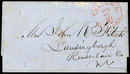 (El Dorado) Culloma, Alta Cal, Jan 28/40. Red cds on stampless folded letter to Lansingburgh, New York, letter from a miner is headed "Rocky Chucky Jany 26th 1851" and reports that money drafts are unavailable there "as John T. Little + Co. have failed", bleach spots at top, F.-V.F. Estimate; $200 - 300. US$200-300 (Image)
