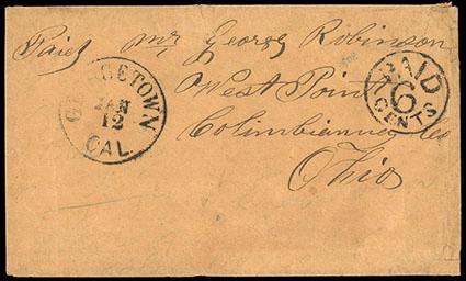 (El Dorado) Georgetown, Cal., Jan 12. Cds (Williams ELD-1400, R5) on ca. 1854 cover to West Point, O., matching "Paid 6 Cents" in circle at right; some wear and small repaired lower right corner, F.-V.F., a rare town and rate handstamps. Estimate; $150 - 200. US$150-200 (Image)