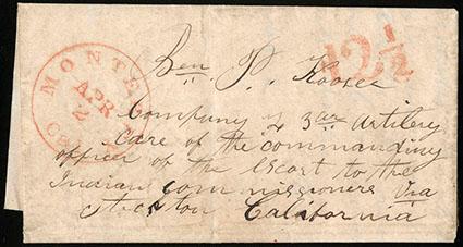 (Monterey) Monterey Cal, Apr 2. Red cds (MOT-1620) and matching "12½" rating handstamp of the West Coast rate on 1851 folded letter from brother to a soldier "Ben. P. Kooser, Company F 3rd Artilery, care of the Commanding officer of the escort to the Indian commissioners, via Stockton California", mostly news from home including "monterey is duller than ever…", Very Fine, a rare 12½¢ California rate. Estimate; $400 - 600.
