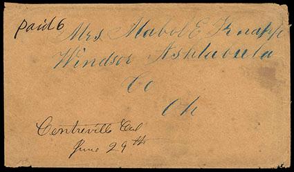 (Nevada) Centreville, Cal. June 29th. Black manuscript postmark (Williams NEV-230) with matching "Paid 6" rate on buff cover to Ohio; original enclosure datelined "June 27th 1852 Centreville Ne Co. Cal." contents read, in part, "…Since I last wrote I have been compelled to quit my claim in this place in consequence for the want of water, on the 10 I left this place it being some 5 miles south from Nevada City and went some 10 miles North of Ne to a place called Cherochee Corell…The Governor in his last estimated the Pop at 30,000 it is estimated that thare will be 60,000 who will cross the Plains. People are apt to make wild estimates on Cal prosperity…Eli Knapp,"; general light wear, F.-V.F., a rare California manuscript postmark. Estimate; $200 - 300.