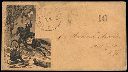 (Nevada) Grass Valley, Cal. Oct 14. Cds (NEV-630) with "10" handstamp rate marking on buff cover to Westfield, Mass; illustrated J.M. Hutchings' California Envelope showing Expressman on Horseback Delivering "Letters From Home" To News-Starved Miners; backflap toned spots, Very Fine and rare, one of ten recorded examples of this illustrated miner's cover. Estimate; $1,000 - 1,500. US$1,000-1,500 (Image)