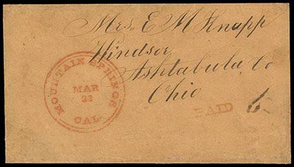 (Placer) Mountain Springs, Cal., Mar 22 (1854). Excellent red strike of balloon type double circle postmark (PLA-2590) with matching "PAID" and manuscript "6", to Ohio, Extremely Fine and rare California postmark,ex-Tatham. Estimate; $300 - 400. US$300-400 (Image)
