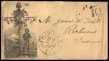 (Placer) Ophirville, Cal., 29 Aug. Partially struck postmark (PLA-2840) with manuscript date on cover to Richmond, Indiana, with large "10" rate handstamp, Miners' Coat of Arms, illustrated Barber & Baker design showing Miner and Bear Hold Up Cross with Various Miner Implements; some cover faults including small defect affecting imprint at bottom, Very Fine appearance, a rare design with twelve examples recorded by Kutz. Estimate; $500 - 750. US$500-750 (Image)