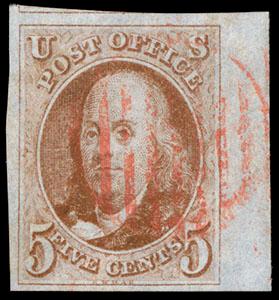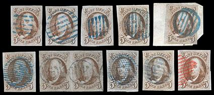 1847, 5¢ red brown, 19 singles and one pair. In a lovely array of shades, each with grid cancel, including New York red square grid, Dot in "S" variety with magenta grid, several identified on certificates such as orange 6-bar grid of Waukegan, Illinois, seven struck in blue including 7-bar grid and 16-bar open grid, all have four margins including one with left sheet margin and red-orange grid, pair with black grid, few with trivial faults, F.-V.F., selected by the for overall eye appeal, an outstanding group which would be hard to duplicate, ex-Saadi & Gross, eight with P.F. certificates mostly from late 1980s to early 1990s. Scott No. 1; Estimate $4,000 - 6,000.