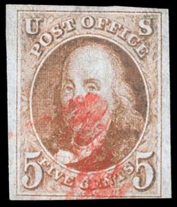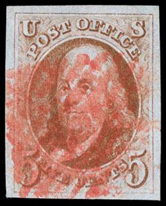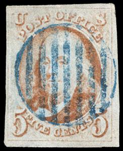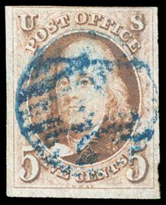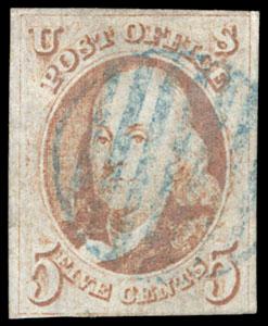 1847, 5¢ red brown. Blue grid cancel, large margins to clear at top, deep color, Very Fine and attractive, with 1987 P.F. certificate. Scott No. 1; $425. US$0 (Image)