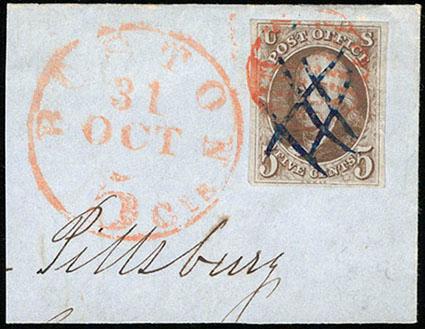 1847, 5¢ red brown. Four large even margins, minor wrinkle, sharp early impression with rich color, neat blue manuscript cancel & tied on small piece by red grid with matching Boston cds alongside, Very Fine and attractive. Scott No. 1; $425. US$0 (Image)