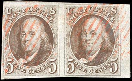 1847, 5¢ dark brown. Right margin horizontal pair, red New York square grid cancels, left stamp with dot in "S" variety, margins large to just in at upper left, strong color; small corner crease at bottom left, otherwise Very Fine. Scott No. 1a; $1,250. US$0 (Image)