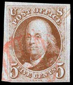 1847, 5¢ orange brown. Four large margins to just clear at bottom right, rich color and clear impression from the cleaned plate, red New York square grid cancel, lightly oxidized, F.-V.F., a pretty Orange Brown stamp, with 1998 P.S.E. certificate as Pale Brown and 2004 Saadi certificate correctly identifying it as an Orange Brown. Scott No. 1b; $675. US$0 (Image)