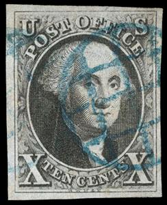 1847, 10¢ black. Four large margins, deep color with sharp impression, fancy blue crosshatch grid cancel of Ottawa, Ill., included is defective cover front from which this is removed, Very Fine and a rare fancy cancel on the 1847 issue,ex-Sampson, with 2025 P.S.A.G. certificate. Scott No. 2; $850. US$0 (Image)