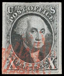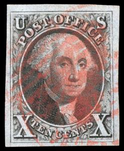 1847, 10¢ black. Four large well balanced margins, rich color with light unobstrusive red cancel, Extremely Fine, a beauty, with 1979 A.P.S. certificate. Scott No. 2; $850. US$0 (Image)