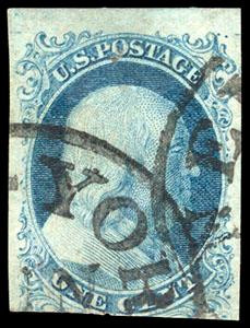 1851, 1¢ blue, type Ib. Pos. 9R1E, neat New York cds, huge margins to touched at bottom, bright color; small repair at bottom & faint horiz. crease, Extremely Fine appearance. Scott No. 5A; $6,000.