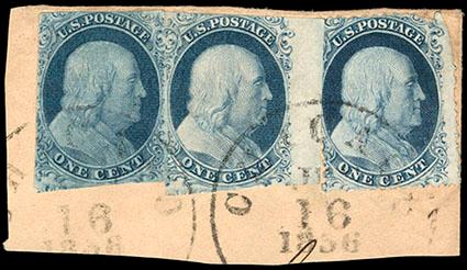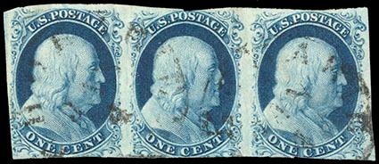 1851, 1¢ blue, type IIIa. Positions 37-39R4, horizontal strip of 3, light town cancels, deep color; mild creasing, Fine appearance, with 2013 Weiss & 2020 Crowe certificates. Scott No. 8A; $2,950. US$0 (Image)