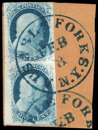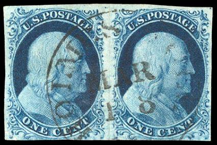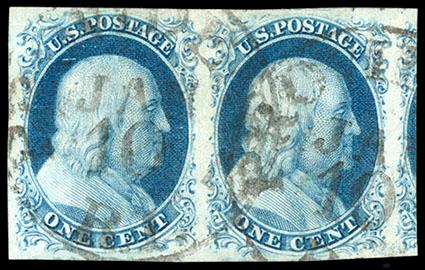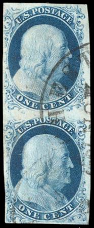 1851, 1¢ blue, type IIIa. Vertical pair, neat town cancels, margins large to just touching, both stamps showing wide breaks in outerline at top, bold color, Very Fine, with 1998 P.F. certificate. Scott No. 8A; $2,500. US$0 (Image)