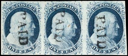 1851, 1¢ blue, type II. Horizontal strip of 3, neat "Paid" straight line cancels, margins large to just touching at bottom, bold rich color on bright paper, Very Fine and attractive, with 1991 P.F. certificate. Scott No. 7; $500. US$0 (Image)