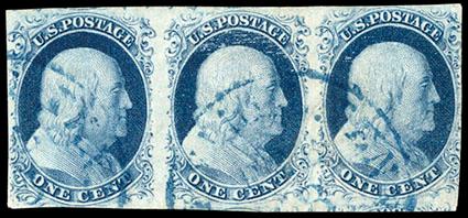 1851, 1¢ blue, type II. Horizontal strip of 3, blue town cancels, margins large to just into scrolls at right, strong color, Very Fine. Scott No. 7; $475. US$0 (Image)