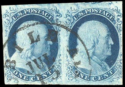 1851, 1¢ blue, type IIIa. Plate 4, horizontal pair, neat Mobile, Ala. town cancel, both stamps showing wide breaks in frameline at top, margins large to just touching at right, deep dark shade, Very Fine, an attractive and very scarce pair from plate four, with 1974 P.F. certificate. Scott No. 8A; $2,500. US$0 (Image)
