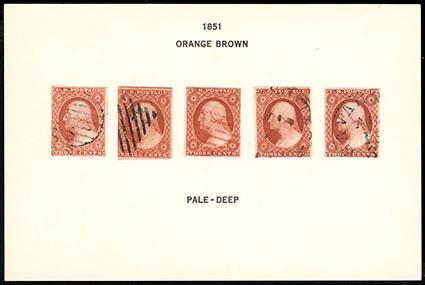 1851-57 3¢ Color Study Formed by Dr. Amonette. A wonderful color study all mounted on Dr. Amonette's cards consisting of twelve singles & one cover of the 1851 orange brown & 65 singles of 3¢ dull red shades, the cover is with rare Copperish Brown shade plus a nice Plum off cover single, Very Fine. Scott No. 10-11; Estimate $3,000 - 4,000.