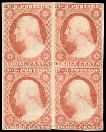 1852, 3¢ dull red, type I. Block of 4 (Pos. 27-28/37-38R4), o.g., light hinged once at center, large margins to just in at bottom, fresh color, light horiz. crease at bottom, Very Fine, the top pair is Extremely Fine,ex-Caspary. Scott No. 11; $2,100. US$0 (Image)