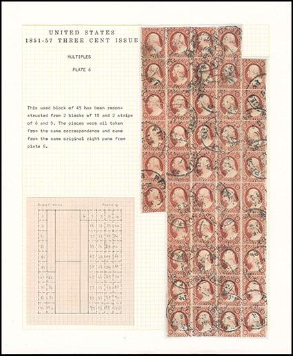 3¢ brownish carmine, type I, reconstructed block of 45 from the right pane of plate 6. Made from two blocks of 15 and strips of six and nine, all taken from the same correspondence, faults but still a remarkable plating piece, handsome Very Fine appearance. Scott No. 11 var.; Estimate $2,000 - 3,000. US$2,000-3,000 (Image)
